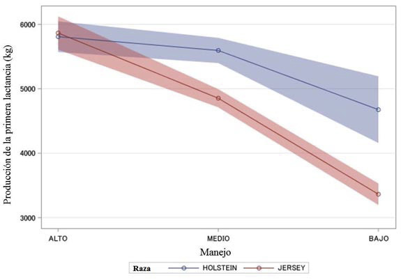 La variable de manejo global, analizada en interacción con la raza en el modelo estadístico, evidenció una disminución de la producción de leche conforme los sistemas de crianza pierden eficiencia, tanto en animales Jersey como Holstein (Figura 4). Las terneras Holstein desarrolladas con manejo de alta calidad, produjeron 213,9 kg (PPL: 5809,0; IC95%: 5570,6-6047,4) más de leche en su primera lactancia que las novillas con una crianza media, y 1132,7 kg más que las de sistemas de baja calidad de manejo (PPL: 4676,3; IC95%: 4158,3-5194,3). En la raza Jersey se observó la misma tendencia, ya que las terneras procedentes de sistemas de crianza más eficiente presentaron 2503 kg de leche (PPL: 5865,9; IC95%: 5608,1-6123,7), más que las criadas en sistemas deficientes (PPL: 3363,4; IC95%: 3197,0-3529,8).