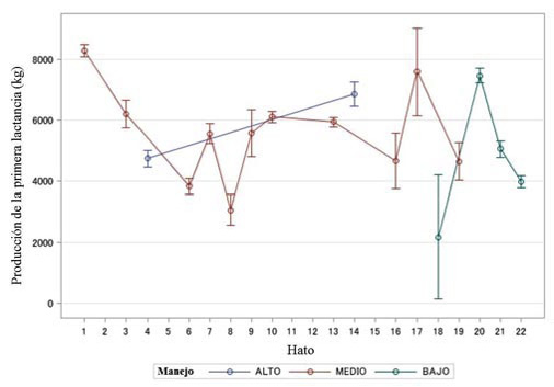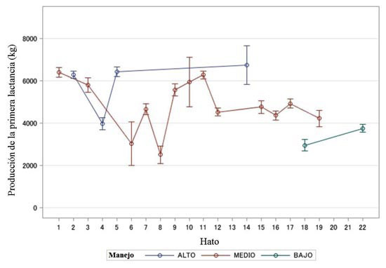 Figure 6. Marginal means and confidence intervals 95% for first lactation milk yield variable in Jersey farms grouped by management (high, medium, low). Cohort retrospective study, of 2747 dairy cows of twenty-two milk farms of Costa Rica. First calving between 2013 and 2015.
