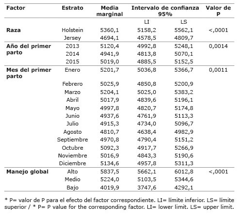 Las vacas Holstein presentaron una producción promedio a 305 días de 5360,1 kg (IC95%: 5158,2-5562,1), 666 kg más que lo reportado para la raza Jersey (PPL: 4694,1kg; IC95%: 4578,5-4809,7) (Cuadro 3). Con respecto al año del primer parto, las hembras con su primer parto en 2013 presentaron niveles de producción de leche ligeramente más elevados (PPL: 5120,4kg; IC95%: 4992,8-5248,1), que las vacas que parieron por primera vez en los años 2014 y 2015 (Cuadro 3). Se pudo determinar que el mes del primer parto de la hembra puede afectar la PPL (P: 0,0011), lo que evidencia una tendencia a la baja en los meses de transición climática. Los animales que parieron por primera vez en los meses de junio, julio y agosto, registraron valores de producción de leche más bajos, con producciones de 4937,6 kg (IC95%:4761,9-5113,3), 4915,3 kg (IC95%:4734,0-5096,7) y 4810,7 kg (IC95%:4638,4-4982,9), respectivamente. Además, las vacas paridas en los meses de enero (PPL: 5201,7 kg; IC95%: 5036,8-5366,7) y marzo (PPL: 5204,1 kg; IC95%: 5025,0-5383,2) presentaron mayores niveles de producción de leche (Cuadro 3).