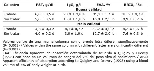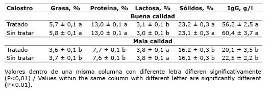 La calidad del calostro difirió significativamente (P<0,01) entre las diferentes categorías (mala y buena), siendo el calostro de buena calidad el que presentó la mayor concentración de grasa (5,75%), proteína (13,0%), sólidos totales (23,1%) e IgG (58,3 g/l).