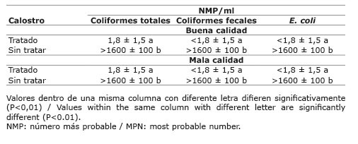 Algunos de los patógenos que pueden estar presentes en el calostro, ya sea provenientes de la glándula mamaria o de la contaminación en el manejo del mismo, y que pueden ser transmitidos a las terneras incluyen: Mycobacterium avium spp. paratuberculosis, Salmonella spp., Mycoplasma spp., Listeria monocytogens, Campylobacter spp., Mycobacterium bovis y E. coli (Domínguez et al., 1997; Stabel, 2001; Stabel et al., 2004; Godden et al., 2006). Estos agentes infecciosos pueden ocasionar enfermedades como la enteritis y la septicemia. También la presencia de bacterias en el intestino delgado puede interferir con la absorción de las Igs (Stewart et al., 2005). Tal como se indicó anteriormente, otros estudios han demostrado una reducción significativa en el conteo bacteriano del calostro tratado con calor a 60 °C durante 30 o 60 minutos (Godden et al., 2006; Elizondo-Salazar et al., 2010; Donahue et al., 2012). Tal como ocurrió en este estudio, el tratamiento térmico redujo significativamente (P<0,01) los coliformes totales, coliformes fecales y E. coli.