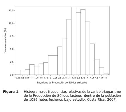 La distribución de la variable endógena en la publicación estudiada, presentó un sesgo negativo, con un 75%, 50% y 25% de los hatos con log(SOL) menores de 3,80; 3,30 y 2,70, respectivamente; equivalentes a producciones de 44,7; 27,1 y 14,9 kg sólidos lácteos/semana/ha (Figura 1). En la escala original, se observó un promedio de 32,5 kg de sólidos lácteos/semana/ha con una desviación estándar de 23,5 kg.
