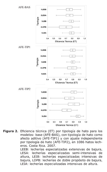 Las ET obtenidas del modelo AFE-TIP2 se calcularon a partir de cinco distintas fronteras de eficiencia, razón por la cual tendieron a ser más variables y a presentar diferencias más marcadas entre las tipologías (Cuadro 4 y Figura 2). Aunque el ordenamiento relativo de las distintas tipologías, según AFE-TIP2, fue similar al obtenido para AFE-BAS, se apreció una diferencia de 17% entre los hatos más eficientes (LEIA) y los menos eficientes (LDPB).