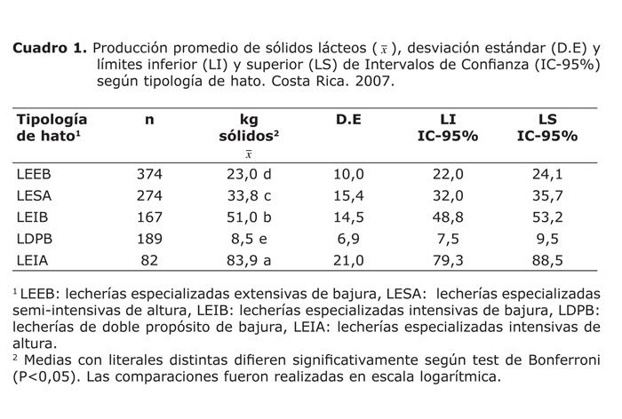 Las demás tipologías correspondieron a niveles intermedios entre los dos casos anteriores. La tipología con la segunda mejor producción de sólidos (LEIB) correspondió a lecherías intensivas con ganado especializado, ubicadas en zonas bajas con temperaturas y precipitaciones altas. En esta tipología hubo una alta incidencia de sistemas semiestabulados, completos o combinados con pastoreo, los cuales predominaban sobre el pastoreo continuo. La tipología LEEB, con el tercer promedio de producción de sólidos, incluyó mayormente lecherías especializadas de bajura, en zonas calientes y húmedas, pero a diferencia de las LEIB eran más extensivas, ya que predominó el pastoreo y utilizaban menos concentrado y suplementos por hectárea. La tipología LESA, con el cuarto promedio de producción de sólidos, correspondió a lecherías semi-intensivas con ganado especializado, ubicadas en zonas altas con menores temperaturas. Estos hatos utilizaban menos concentrado, suplementos y fertilizantes que los sistemas intensivos de LEIA.