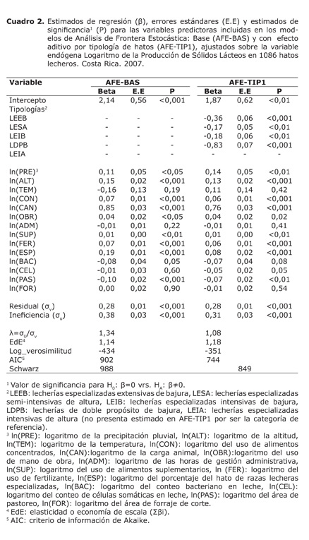 Elasticidades de Escala (EdE). Otro parámetro que pudo estimarse a partir de los modelos de AFE fue la Elasticidad de Escala (EdE, Cuadro 2), el cual se obtuvo como la sumatoria de los coeficientes β. Se obtuvieron valores de EdE de 1,14 y 1,18 a partir de los modelos AFE-BAS y AFE-TIP1, respectivamente. Ambos valores fueron mayores que 1, lo que denota que la producción de sólidos lácteos en estos hatos tendió a asociarse positivamente con la escala de producción. Otros estudios han reportado valores de EdE de 1,00 (Cabrera et al., 2010), 1,13 (Schilder y Bravo, 1993), entre 1,03 y 1,13 (Moreira et al., 2004) o entre 1,07 y 1,23 (Bravo-Ureta et al., 2008). Estos valores son similares, aunque ligeramente inferiores, a los obtenidos para los hatos locales. Una diferencia marcada del presente estudio con respecto a todas las investigaciones consultadas es la inclusión del grupo de LDPB, lo que pudo ser un factor importante en la diferencia observada en la magnitud de EdE.