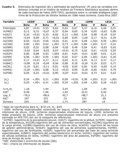 El modelo anterior está basado en el supuesto de que las condiciones para todos los hatos de la población son similares. Se ha sugerido que las evaluaciones de ET deben ser realizadas entre unidades de producción de similar nivel tecnológico (Alvarez et al., 2008). Por este motivo, se exploraron dos alternativas adicionales de ajuste. En la primera alternativa, denominada en adelante AFE-TIP1, se agregó al modelo base la variable predictora categórica de tipología de hato. De esta manera, se obtuvieron coeficientes aditivos para las cinco tipologías de hatos descritas anteriormente (LEEB, LESA, LEIB, LDPB, LEIA), según clasificación obtenida por Vargas-Leitón et al. (2013). Mediante este modelo, los coeficientes b y los estimados de V y U son corregidos por las diferencias entre estas tipologías. En la segunda alternativa, denominada en adelante AFE-TIP2, se ajustó el mismo modelo base, pero de manera independiente dentro de cada conglomerado. Esto equivale a ajustar cinco diferentes fronteras de eficiencia, cada una con su estimados de V y U, así como cinco diferentes conjuntos de coeficientes b.