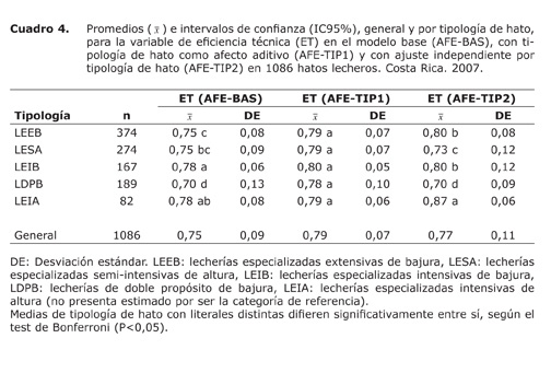 Previos análisis de eficiencia realizados con hatos lecheros han reportado resultados similares. En una revisión de once estudios que utilizaron la metodología AFE con hatos lecheros, se reportó una media global de ET de 0,80, variando entre 0,59 y 0,89 (Schilder y Bravo, 1993). En otra revisión realizada, basada en nueve estudios que utilizaron AFE en hatos lecheros, se reportaron medias de ET entre 0,70 y 0,89 (Moreira et al., 2004). Por otra parte, Bravo-Ureta et al. (2008) reportaron estimados de ET de 0,87, 0,85 y 0,81 para hatos de Argentina, Chile y Uruguay, respectivamente. Un estudio más reciente reportó un nivel promedio de ET de 0,88±0,08 en un conjunto de 273 hatos lecheros (Cabrera et al., 2010). Murova y Chidmi (2009) reportaron el valor más alto para ET, de 0,98, para 1774 hatos lecheros en USA.