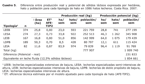 Se realizó una estimación del potencial máximo de producción basado en los resultados del modelo AFE-TIP2 (Cuadro 5). De acuerdo con esta estimación, en la población de hatos analizada, la producción de sólidos lácteos podría incrementarse hasta un total de 207 547 kg por semana, los cuales equivalen aproximadamente a 1,85 t por semana (96,4 t anuales) de leche fluida. En términos relativos esto significaría aproximadamente un 10% de la producción anual de leche en Costa Rica, la cual se estimó en 966,3 t para el año 2010 (González-Echeverría, 2012). En síntesis, los resultados denotan que existe un margen de mejora considerable para los sistemas de producción lechera.