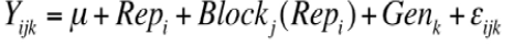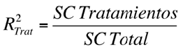 En cada experimento, a la variable rendimiento de grano se le calculó los distintos componentes de varianza del modelo lineal. Para esto se utilizó el método REML implementado en el procedimiento MIXED de SAS (Vargas et al., 2013). Adicional a las varianzas o cuadrados medios (CM) del modelo (CM repetición, CM bloque x repetición, CM tratamientos y CM error), se calculó: el coeficiente de variación (CV), repetitividad (h2), rango, diferencia mínima significativa (DMS), error estándar (EE), coeficiente de determinación (R2) de los tratamientos y R2 de la fracción no explicada por el modelo (residuo). Adicional a estos estadísticos se calculó la razón entre el DMS y el rango del experimento (D/R). Las fórmulas utilizadas para el cálculo de los estadísticos fueron las siguientes (ec. 1, ec. 2, ec. 3, ec. 4, ec. 5, ec. 6, ec. 7, ec. 8 y ec. 9):