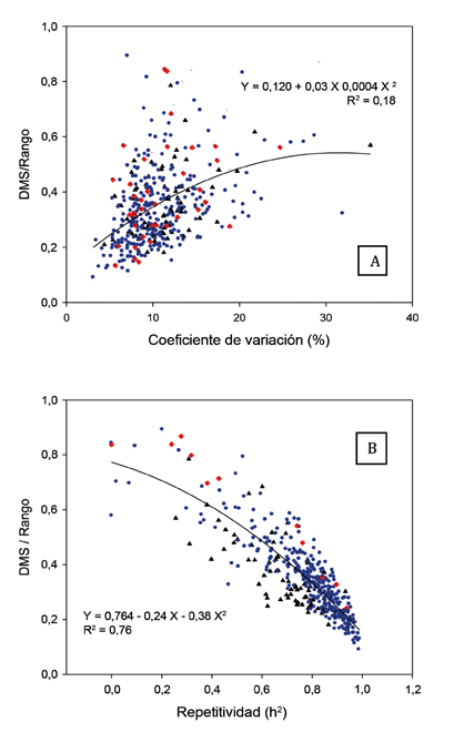 Al relacionar ambos estadísticos (CV y h2) con el cociente DMS/Rango se encontró que la h2 está altamente correlacionada con este cociente, mientras que el CV no lo está. En términos generales, estos resultados permiten indicar que la repetitividad es un mejor indicador que el CV, como estimador de buena precisión experimental, debido a que considera en su estimación, la variabilidad por los tratamientos y no la variación del error experimental.