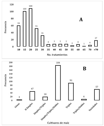 En total se analizaron 406 experimentos, todos con el diseño Alfa Látice (Vargas et al., 2013). El número de tratamientos evaluados en estos ensayos fue variado; el número máximo de tratamientos evaluados en un ensayo fue de 150, mientras que el ensayo con el menor número incluyó ocho entradas (Figura 1A). La base de datos que se analizó incluyó 234 ensayos de adaptación de materiales comerciales y semi-comerciales, sembrados fuera de la estación experimental y 172 ensayos de cultivares experimentales sembrados en la Estación. El material genético incluyó viveros de líneas endogámicas (L), híbridos simples (S), triples (T), dobles (D) y variedades sintéticas (V) (Figura 1B).