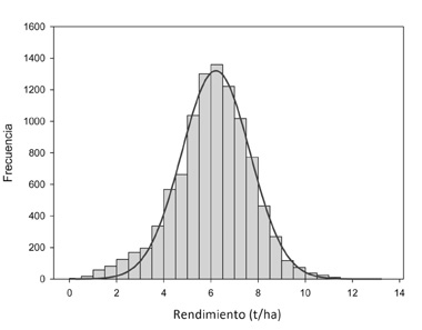 El análisis general de los datos de rendimiento y el cálculo de los principales estadísticos descriptivos se presenta en el Cuadro 1. El resultado de este análisis indicó una media de 6,07 t/ha y varianza de 2654 t/ha. Se elaboró un histograma con todos los datos y la hipótesis de normalidad fue significativa, indicando que los datos analizados tienen una distribución normal con media cero y varianza uno (Figura 2).
