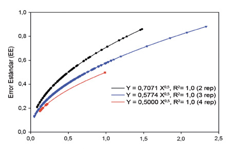 Al graficar el cuadrado medio del error (CME) contra el EE de cada ensayo, se observaron tres curvas bien demarcadas. Estas corresponden al número de repeticiones empleadas para la formación de cada uno de ellos. Al analizar este resultado, se observó que para un mismo valor del CME, el EE aumentó al pasar de la curva de tres a la de dos repeticiones. Esto implica que se tiene menos precisión en un ensayo con dos repeticiones, dado que el valor del DMS o cualquier otro estadístico para separar las medias es mayor. Esta misma relación se observó del pasar de cuatro a tres repeticiones, pero la ganancia en precisión fue más baja, dada la menor diferencia entre estas dos curvas (Figura 3), Gauch y Zobel (1996), encontraron que mayor número de repeticiones reduce el error experimental.