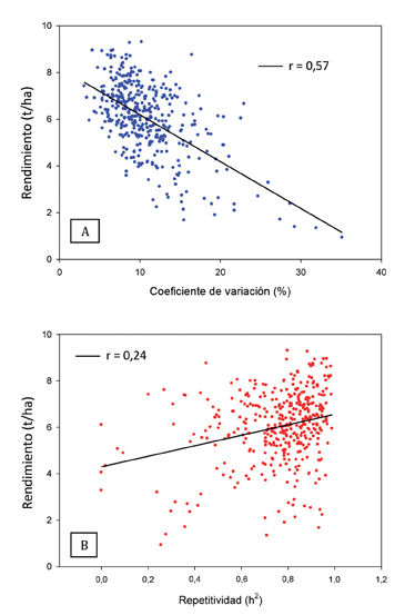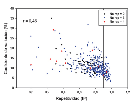 Por otro lado, al relacionar el CV con h2 no se encontró una relación entre ambos estadísticos, al estimarse un coeficiente de correlación de 0,46. Resultados similares de poca relación entre estos dos parámetros fueron señalados por Yan y Holland (2010). No obstante, en la Figura 5 se presenta la tendencia de esta situación, siendo la misma inversa; es decir, que a mayor valor de repetitividad menor fue el coeficiente de variación. También se observa que valores de h2 mayores de 0,90 presentaron menor dispersión de CV, posiblemente porque la variabilidad experimental se debió a efectos genéticos y una baja proporción de la variabilidad debido al error experimental que normalmente aumenta y dispersa el valor del CV.