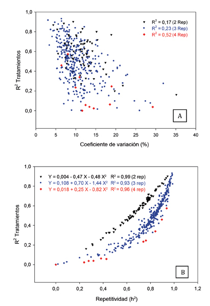 Para estimar la precisión de los experimentos se relacionaron los estadísticos CV y h2 con los coeficientes de determinación del modelo (R2Trat y R2No explicado). Se graficaron ambos parámetros con el coeficiente de determinación de los tratamientos y se encontró que el CV presentó un R2 de 0,17, 0,23 y 0,52 para los ensayos con dos, tres y cuatro repeticiones, respectivamente (Figura 6A). Estos coeficientes son muy bajos con respecto a los valores encontrados en la relación del R2 de tratamiento vs repetitividad cuyos coeficientes de determinación fueron de 0,99, 0,93 y 0,96 para estos mismos ensayos (Figura 6B). En resumen la relación del h2 con el R2 de los tratamientos resultó directa. Estos resultados indican que un valor alto de h2 (cercano a 1,0) está muy correlacionado con un valor alto del R2 de tratamientos, interpretándose por consiguiente que la mayor variación del experimento se debió a la alta variabilidad entre los tratamientos evaluados (Yan y Holland, 2010). Por el contrario, un valor bajo del h2 sugiere que hubo una baja variabilidad entre los tratamientos o un alto valor del cuadrado medio del error, lo que indicaría un mal manejo del experimento (Martínez, 2005). Se encontró una diferencia entre las respuestas según el número de repeticiones de los experimentos, en donde valores más bajos del R2 de tratamientos presentaron valores más altos de repetitividad.