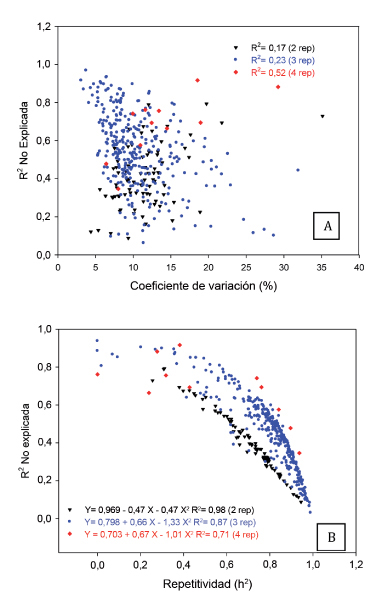 Al analizar los estadísticos CV y h2, con el coeficiente de determinación de la fracción no explicada del modelo (residuo o R2 del error). Donde el coeficiente de variación no presentó ninguna relación con el error, este presentó un R2 de 0,17, 0,23 y 0,652 para dos, tres y cuatro repeticiones, respectivamente (Figura 7A). Por el contrario, el coeficiente de repetitividad presentó altos valores de R2 en las ecuaciones que relacionaron este estadístico con el R2 del error con valores de 0,98, 0,87 y 0,71, respectivamente. (Figura 7B). Los resultados de ambos análisis indican claramente, que la repetitividad es un estadístico más relacionado con los componentes de la varianza del modelo que señalan buena precisión experimental, mas no el coeficiente de variación cuya relación depende de la magnitud de la media ambiental del experimento (Yan y Holland, 2010).