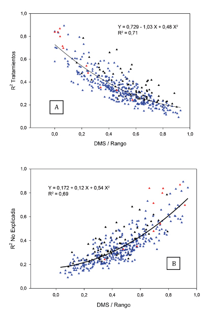 Por definición, la precisión experimental está relacionada con la capacidad de encontrar diferencias entre los tratamientos evaluados (Steel y Torrie, 1980). Para estos fines se calculó el cociente entre el estadístico (DMS), para determinar si dos medias son diferentes entre sí y el rango o amplitud de las medias calculada de los tratamientos (DMS/Rango=D/R). En este caso se tomó la DMS por ser el estadístico más sencillo para determinar si dos promedios difieren estadísticamente entre sí, pero bien se pudo tomar el valor calculado por Tukey, Duncan u otras pruebas empleadas para la separación de medias, los cuales dependen del nivel de exigencia que se desea utilizar en cada estudio para separar promedios. Cuando este cociente (D/R) se acerca a cero (0,0), indica que existen diferencias entre los tratamientos, mientras que cuando el valor de D/R se acerca a uno (1,0), prácticamente no hay diferencias entre los tratamientos evaluados y por ende se tuvo una baja precisión experimental. Se relacionó este cociente (D/R) con los dos coeficientes de determinación que más interesan del modelo (R2 de tratamientos y R2 de error) y se encontraron ecuaciones con un R2 de 0,71 y 0,69 para tratamientos y error, respectivamente (Figura 8A y 8B). La relación con la variabilidad de los tratamientos fue inversa, lo que implica que a menor valor del cociente (más precisión experimental) mayor es la variabilidad encontrada entre estos. Mientras que con el error la relación es directa, es decir, a menor valor del cociente menor es la variabilidad no explicada del modelo.