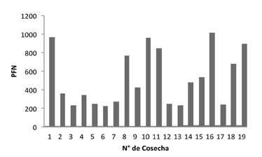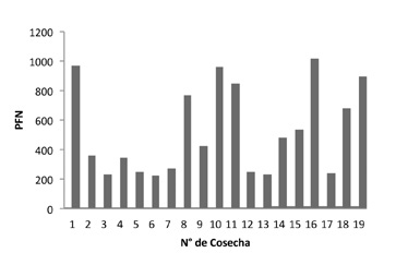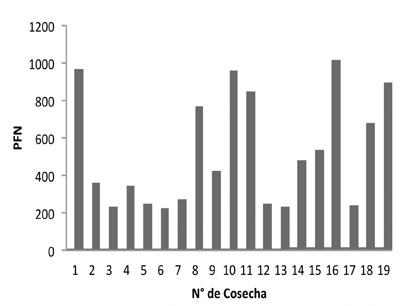 En cuanto a la evolución de la producción promedio de turiones por cosecha, el mismo varió entre 12 500 y más de 51 000, destacándose las cosechas 10 y 16 con 51 250 y 48 750 (a) turiones/cosecha, respectivamente, seguidas de la 4 con 46 250 y la 1 con 42 500 (Figura 2).
