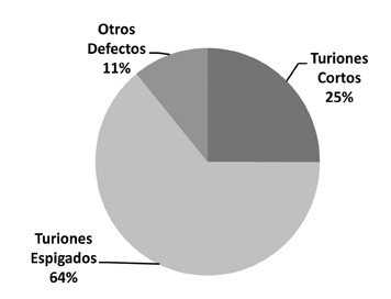 La predominancia del defecto de espigado estaría indicando la necesidad de disminuir el largo de corte en los turiones en cosecha.
