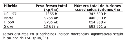 El número promedio total de turiones cosechados fue 572 500, encontrándose diferencia estadística significativa para los híbridos en estudio. Se destacaron Giove (a) y H-668 (a), seguido de Marte (b) y UC-157 (b) (Cuadro 2), los que produjeron un promedio de 24, 21, 13 y 10 turiones/planta, respectivamente. Estos resultados difieren de los obtenidos en el primer año evaluado (2008) del presente ensayo (Castagnino et al., 2012), cuyo promedio general fue de doce turiones/planta y se destacaron los genotipos Marte con 21 turiones/planta, UC-157 con 14 y finalmente, H-668 y Giove con un total de siete turiones/planta. Dichas diferencias indican que la curva productiva de turiones de H-668 y Giove fue más lenta durante los primeros años de la plantación, respecto de la de Marte y UC 157, ya que en el presente (quinto) período de cosecha ha manifestado una menor adaptación genotipo – ambiente, por lo que su cultivo no sería recomendable en condiciones de semiforzado. Esto estaría indicando la conveniencia de iniciar plantaciones con estos dos últimos híbridos solo cuando el objetivo es lograr elevada productividad los primeros años, pero que cuando el objetivo es lograr elevados rendimientos también en el largo plazo, convendría el cultivo de Giove y H-668. No obstante, resulta conveniente continuar evaluando las tendencias productivas de dichos genotipos, algunos años más.