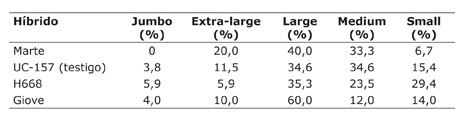 En cuanto a la variable productividad fresca comercial (PFC) también se destacó Giove (a), seguido de UC-157 y H-668 (ab) y finalmente Marte (b) (Cuadro 2).