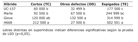 Similar tendencia se observó en la cosecha 2011 con los genotipos italianos, según Risso et al. (2012), quien indicó que Giove logró una productividad de 9062 (a) kg/ha, H-668 de 6187 kg/ha (ab) y Marte de 3625 (b). Diferente comportamiento mostró el híbrido UC-157, ya que en dicho año (correspondiente a la cuarta temporada de evaluación) tuvo un rendimiento de 8437 (a) kg/ha, lo que estaría mostrando que el híbrido UC-157 se encuentra en la etapa de productividad decreciente.