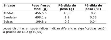 En el caso del empleo de bolsas, estas permitieron conservar casi el 100% del peso fresco, aunque por un período levemente menor a las bandejas, de diecisiete días. El peor comportamiento se logró con los atados cuya calidad comercial se prolongó por diecinueve días.