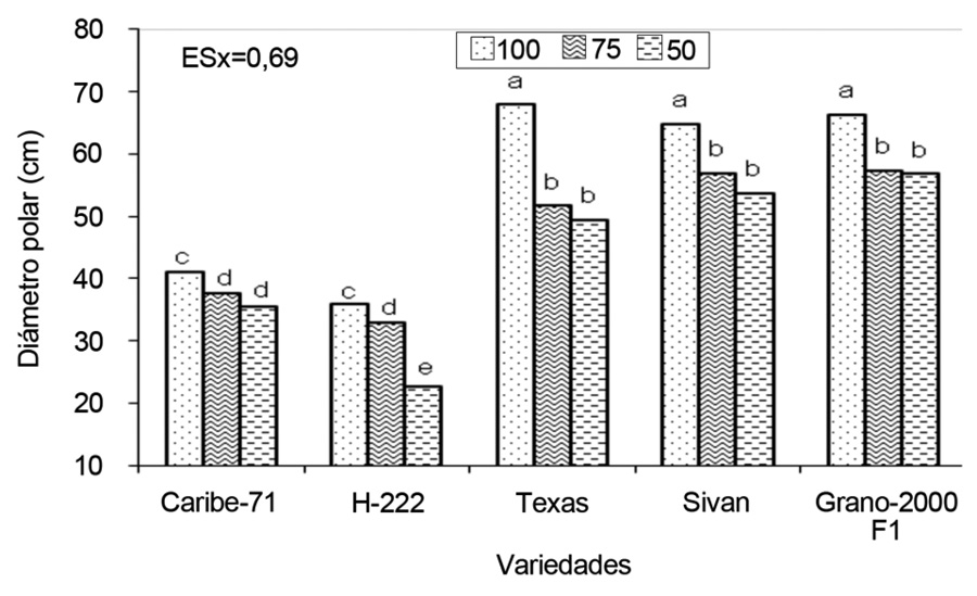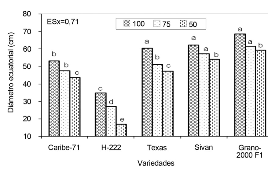 En el 100% de humedad en el suelo, la variedad Grano-2000F1 mostró el mayor diámetro, seguida por las variedades Texas y Sivan, que sin diferencias significativas entre ellas, superaron estadísticamente a las variedades Caribe-71 y H-222; esta última también fue inferior que la Caribe-71. En los niveles de 75 y 50% de humedad en el suelo, también se destacó la variedad Grano-2000F1, pero sin diferencia significativa respecto la variedad Sivan. Ambas superaron estadísticamente al resto de las variedades. También se observó que no hubo diferencia estadística entre las variedades Caribe-71, Texas y la variedad H-222 que fue la de menor valor.