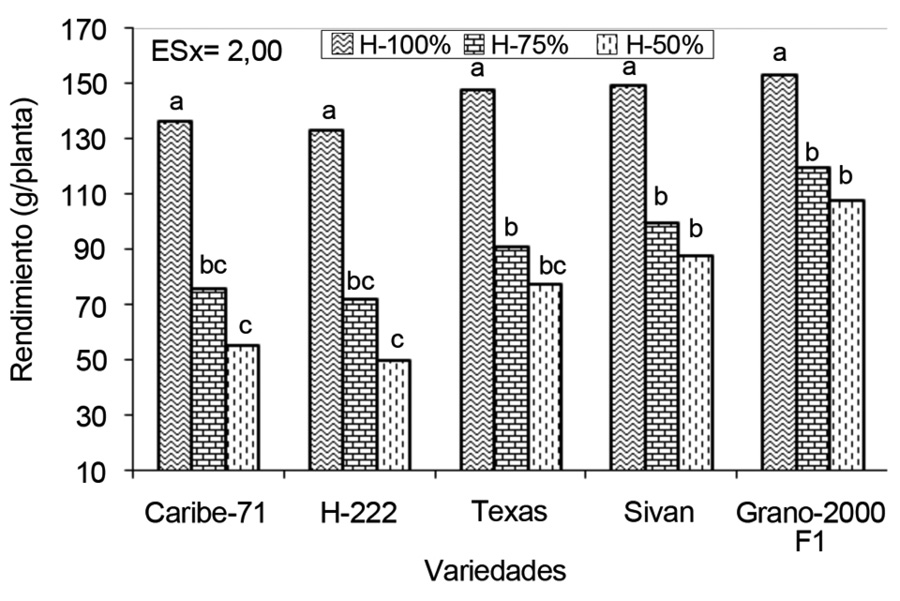 Los valores expresados por las variedades Caribe-71 y H-222 en el tratamiento de 75% de humedad en el suelo, no difirieron estadísticamente de los obtenidos en el nivel de 100% de humedad, lo cual significa que una disminución del 25% de humedad, en estas variedades, no afectó significativamente. Lo contrario ocurrió en las variedades Texas, Sivan y Grano-2000F1 que expresaron los mayores valores en el nivel de 100% de humedad en el suelo.