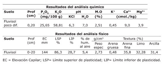 Según los resultados del análisis físico-químico, el suelo era muy arenoso, no es plástico, posee una velocidad de infiltración alta, además tiene un pH ligeramente ácido a neutro, contenido medio de fósforo (P2O5), alto contenido de potasio (K2O), porcentaje de materia orgánica (M.O) bajo, presentaba valores bajos en potasio (K), calcio (Ca), y magnesio (Mg).