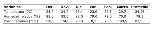 Al analizar las variables climáticas (Cuadro 2), se observó que la temperatura entre los meses de octubre a marzo se comportó entre 22,5 y 29,7 °C, las cuales se aproximan al rango óptimo establecido para el cultivo de cebolla por MINAGRI (1983), quien indica que la temperatura para este cultivo debe oscilar entre los 23 y 25 °C. La humedad relativa para estos meses se comportó entre 70 y 85%; este mismo autor plantea que la humedad relativa adecuada para la cebolla es de 80-85%, siendo en meses evaluados similar a estos rangos, excepto en algunos meses que estuvo levemente por debajo, pero esto no influyó en el rendimiento. Por otro lado, las precipitaciones en estos meses fueron muy bajas, aunque en el mes de marzo incrementaron a 198,5 mm. De manera general, se considera que el comportamiento del clima no influyó en los resultados finales, ya que fue similar para todos los tratamientos y el mismo no fue una limitante para el cultivo en esta etapa.