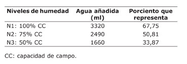 Las macetas consistieron en recipientes plásticos con volumen de 6 l, con diámetro superior de 21,5 cm, un diámetro inferior de 15 cm y una altura de 21,5 cm. En cada maceta se depositó el sustrato compuesto, descrito anteriormente. Se utilizaron tres niveles de humedad en el sustrato: N1: humedad al 100% de la capacidad de campo, N2: humedad al 75% de la capacidad de campo, N3: humedad al 50% de la capacidad de campo.