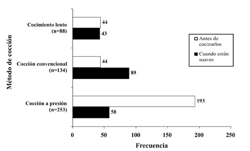 Durante el proceso de cocción la adición de sal a los frijoles, en ambas zonas, se realizaba en dos momentos: cuando se iban a poner a cocinar los frijoles (53% en la zona rural y 66% en la zona urbana) y cuando los frijoles estuvieron suaves (47% en la zona rural y 34% en la zona urbana).