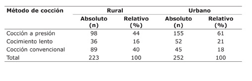 En la zona rural, los métodos más utilizados eran la cocción a presión y la cocción convencional, mientras que en la zona urbana la cocción a presión era la más usada (Cuadro 1).