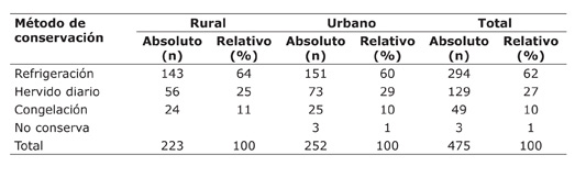 La utilización de estos tres métodos en ambas zonas tuvo el mismo comportamiento; el método más utilizado fue la refrigeración, seguido por el hervido frecuente y por último, con un menor uso la congelación.
