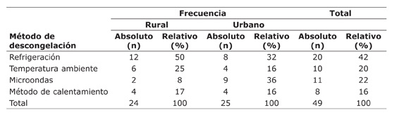Con respecto a la forma de descongelación de los frijoles se puede identificar una diferencia en cuando a la práctica seguida en las poblaciones estudiadas (Cuadro 4). El método de descongelación de los frijoles en refrigeración fue el más utilizado en la zona rural y la práctica de descongelarlos en el microondas era más utilizada en la zona urbana, mientras que la descongelación a temperatura ambiente o como parte del método de calentamiento era similar en las poblaciones estudiadas.