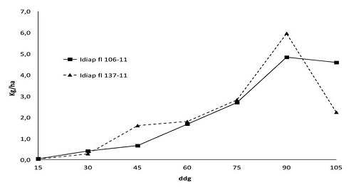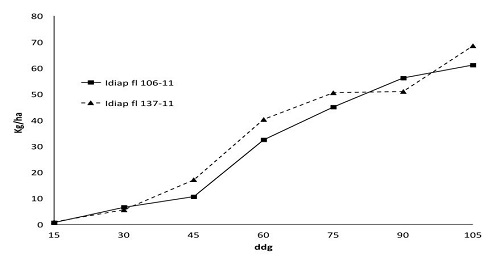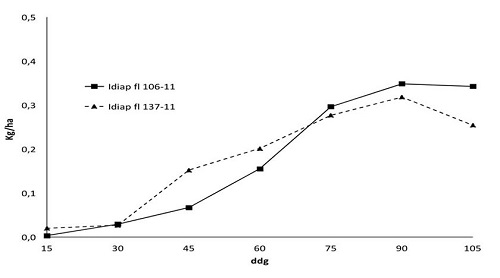 La absorción de N por etapa fenológica, tuvo un comportamiento distinto en las dos variedades de arroz (p<0,001), mientras que la IDIAP FL 106-11 presentó su máxima absorción entre los 75 a 90 días después de germinado (ddg), y coincidió con las fases de embuchamiento (hinchamiento de la panícula dentro de la vaina de la hoja bandera antes de su emergencia) y floración, la IDIAP FL 137-11 presentó dos picos de absorción que coincidieron con el máximo macollamiento (45 ddg) y el embuchamiento ( Figura 3).