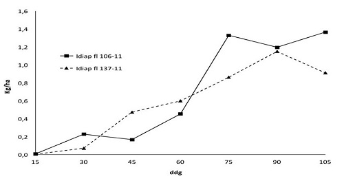 Las variedades de arroz presentaron una dinámica de absorción de P diferenciada (p=0,005); IDIAP FL 137-11 presentó una absorción máxima entre el primordio floral y el embuchamiento (60 a 75 ddg) y en la etapa de maduración (105 ddg), mientras que, la IDIAP FL 137-11 presentó su máxima extracción entre las etapas fenológicas comprendidas entre el primordio floral y la floración ( Figura 4).