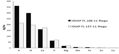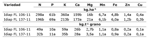 La variedad IDIAP FL 137-11 absorbió mayor cantidad de P, Ca, Mg y Fe que la variedad IDIAP FL 106-11, mientras esta última absorbió mayor cantidad de N, K, Mn, Zn y Cu ( Cuadro 3).