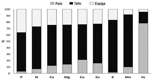 Al observar la absorción de nutrientes de forma relativa ( Figura 13), se distingue que en la raíz, el nutriente que se acumuló en mayor proporción fue el Fe, con casi un 80 % del total, mientras que el K y P concentraron menos del 5 % de su total en este órgano (Figura 13). En los órganos foliares (hoja y tallo), fue donde se dio la mayor concentración de los nutrientes absorbidos por la planta, donde el K y Mn concentraron más del 80 % de su total, y solo el Fe tuvo menos del 50 % concentrado en esta parte de la planta de arroz. El nutriente que proporcionalmente destinó la mayor cantidad de su absorción por la planta hacia la espiga fue el P, con casi un 40 %, mientras que el Mn y el Fe concentraron menos del 10 % de su total absorbido en esta sección.