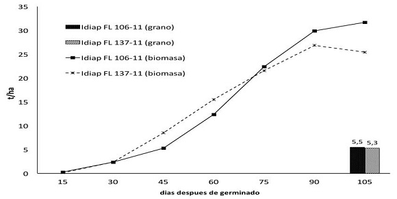 Figure 2. Biomass production and grain yield for rice varieties IDIAP FL 106-11 and IDIAP FL 137-11. Pacifico Marciaga Experimental Field, Penonome, Panama. 2016.