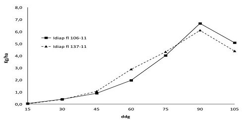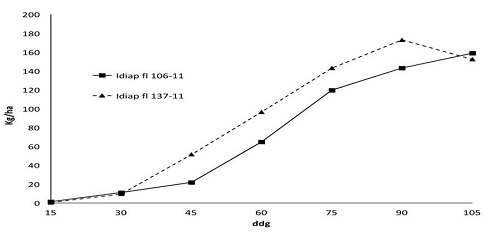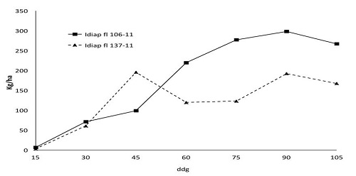La absorción de K tuvo un comportamiento distinto en ambas variedades (p<0,001), la IDIAP FL 106-11 mostró un incremento en la absorción a inicio de macollamiento (30 ddg) y luego presentó su máxima extración de los 75 a 90 ddg, lo que coincidió con las fases de embuchamiento y floración. La IDIAP FL 137-11 presentó dos picos de absorción que coinciden con el máximo macollamiento y la etapa de floración ( Figura 5).