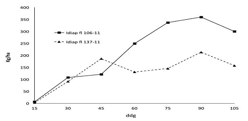 ** = diferencia altamente significativa (p<0,001) / **= highly significant difference (p<0.001).La curva de crecimiento con base en la producción de biomasa seca para ambas variedades tuvo un comportamiento similar, y presentó un aumento lineal hasta la etapa de floración (noventa días después de germinado), donde la variedad IDIAP FL 106-11 continuó incrementando la producción de biomasa, y la IDIAP 137-11 tuvo un decrecimiento. Ambas variedades presentaron productividades estadísticamente similares ( Figura 2).