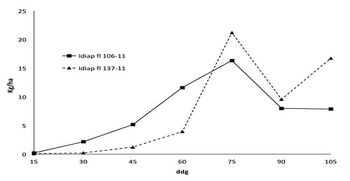 La dinámica de absorción de Fe por ambas variedades fue distinta (p<0,001), donde la IDIAP FL 137-11 mostró un incremento en el máximo macollamiento y luego una extracción máxima durante la floración, mientras que la IDIAP FL 106-11 tuvo la máxima extracción durante la floración ( Figura 9).