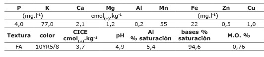 En cuanto a contenido de nutrientes y según los niveles críticos establecidos por el Laboratorio de Suelos del IDIAP ( Name y Cordero, 1987), se registraron niveles altos de Mn, niveles medios de K y Mg; además, hubo niveles bajos de P, Ca, Al, Fe, Zn y Cu. En cuanto a las características físico-químicas del suelo, presentó una textura franco arenosa, con una coloración en seco pardo amarillento (10YR5/8), pH muy ácido, una capacidad de intercambio catiónico efectiva (CICE) baja, con una saturación de Al baja (5,4 %) y una saturación de bases alta, la cual estaba dominada por la saturación de Ca (55,7 %) y Mg (33,5 %); además de un nivel de materia orgánica bajo ( Cuadro 2).