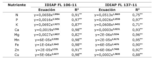 Letras diferentes en las columnas indican diferencias altamente significativas (p <0,001) / Different letters in the same columns indicates highly significant difference (p <0.001).El análisis de regresión mostró que existieron diferencias altamente significativas en la extracción de nutrientes entre las distintas etapas fenológicas del cultivo para las dos variedades (p<0,001). Los coeficientes de determinación o R 2 del modelo de regresión, presentaron ajustes entre 67 y 98 %. Se determinaron las ecuaciones de regresión para la absorción de nutrientes en ambas variedades ( Cuadro 4).