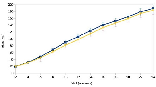 Figure 1. Average height of papaya plants ( Carica papaya L.) Pococi hybrid sexed by the methods: molecular (blue line) and conventional (yellow line), carried out by the farmer eight weeks after transplanting at the beginning of flowering. La Rita, Pococí, Limón, Costa Rica. 2010.