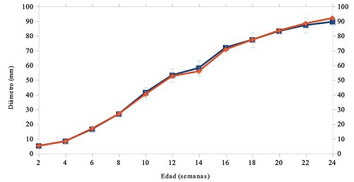 Figure 2. Average in the diameter in plants of papaya ( Carica papaya L.) Pococi hybrid sexed by the methods: molecular (blue line) and conventional (red line), carried out by the farmer eight weeks after transplanting at the beginning of flowering. La Rita, Pococí, Limón, Costa Rica. 2010.