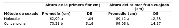 La altura de las plantas sexadas molecularmente (SM) no difirió significativamente (p<0,05) de la de las plantas de sexado convencional (SC), en ninguna de las edades evaluadas ( Figura 1).
