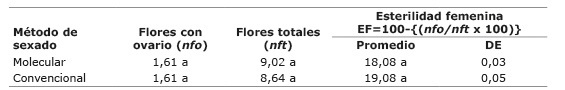 DE: desviación estándar / SD: standard deviation. Medias seguidas de la misma letra en las columnas no presentaron diferencias estadísticas significativas (p≥0,05) / Means followed by the same letter in the columns did not show statistically significant difference (p≥0.05).La esterilidad femenina de las plantas tampoco varió entre ambos métodos de sexado ( Cuadro 2).